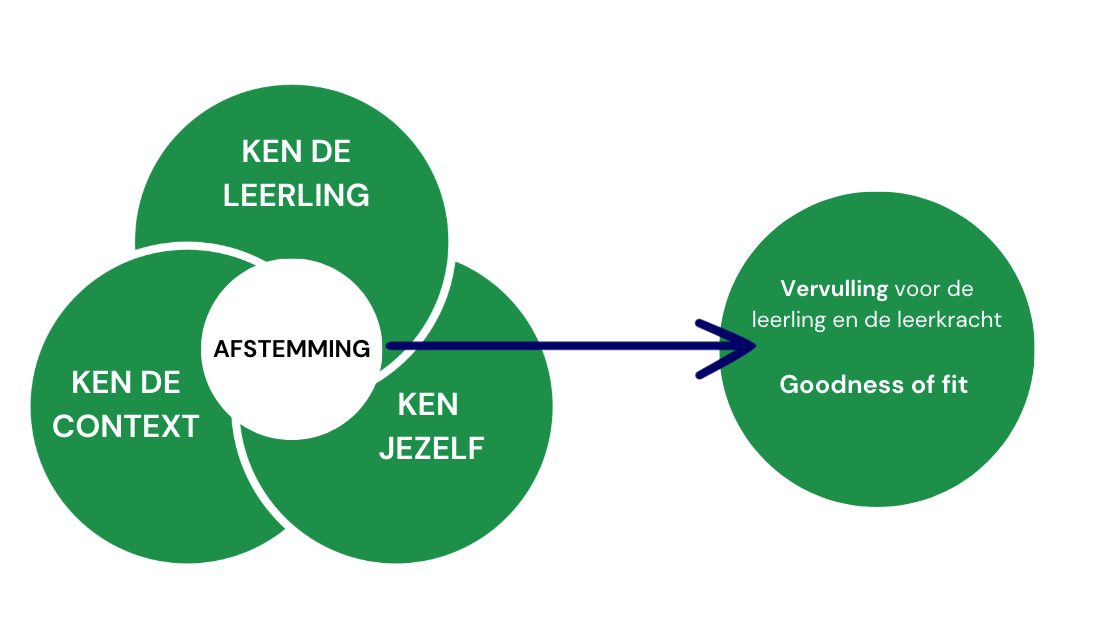 zijn hierbij van belang. In dit kader is het belangrijk dat er op de scholen de komende jaren orthodidactische- en orthopedagogische kennis voorhanden is om doelmatig en doelgericht af te kunnen stemmen. Onze missie/visie is visueel weergegeven in onderstaande afbeelding. Om het doel van optimale afstemming te bereiken, zul je kennis moeten hebben van drie aspecten: de leerling (1), jezelf (2) en de context (3). Met de kennis die uit deze aspecten komt, kun je goed afstemmen en wordt er een ‘goodness of fit’ bereikt (van der Wolf & van Beukering, 2009).